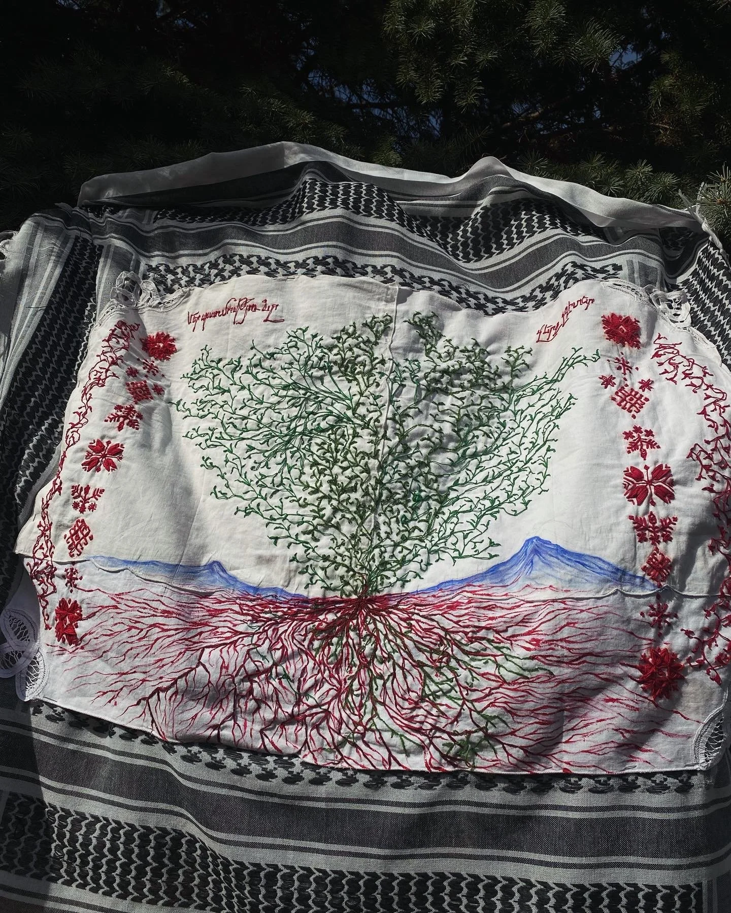 Maral: This is very heavy for me, but I’m gonna get straight into the vulnerability of it. Right after the Artsakh genocide, it was the Gaza genocide. I cannot not see a parallel between the two; I cannot be blindsided and only focus on one. Because I believe in humanity above all. There are just too many parallels between both of our communities and cultures. And at that time, I think like most of us, and still right now, I was in a lot of pain. But art became a way for me to heal, as it always has been. But to really see similarities with another group of people brought me hope. I don’t know how to explain it, but as I was embroidering, especially [the piece I just showed you], I felt like I was regaining some strength to be like, you know what, I can preserve two cultures at once. I can be Armenian and still care about another culture. I think sometimes we’re too much like only Armenian, which is good, right? It’s good. But, we kind of have to see like, okay, you know, genocide is not just… it happens to many different communities. How can we be in solidarity together? And I would say my Palestinian Armenian pieces received the most positive feedback from all of my other pieces because of that solidarity. Like people recognize that, okay, there’s empathy here. I’m not just thinking about my people. Empathy for me is also very crucial.