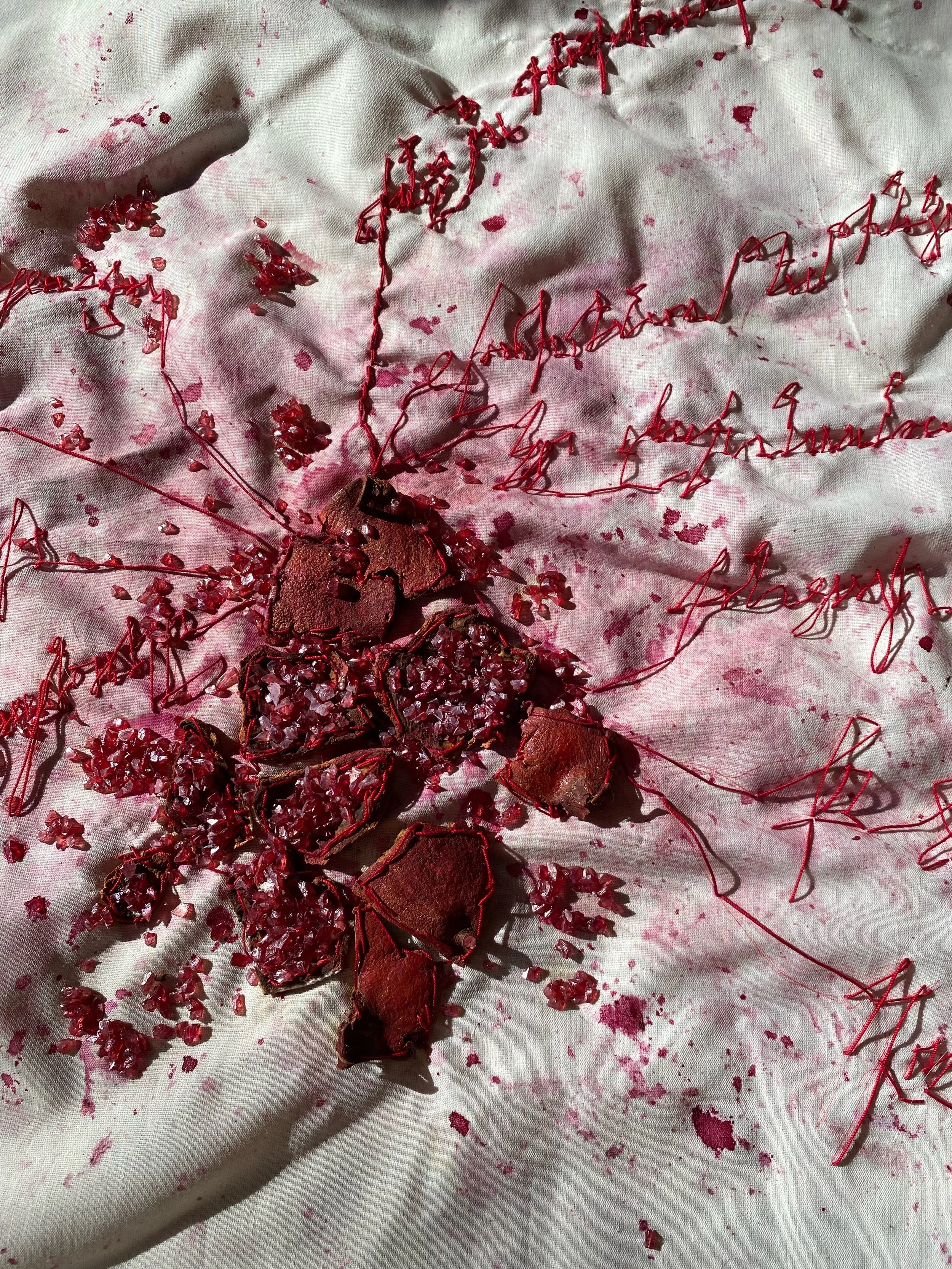 Maral: Yes, it’s a piece I did for my final in university, and it’s called Bloodlines. I began it with a white sheet from my grandmother, whose grandparents and parents actually fled the genocide, so for me, that white sheet is like ‘whoa’. I took the white sheet, and I was bleeding. So I was like, ‘I don’t know how to start this piece. I don’t know how to do this project.’ And I just let the blood be the first point in the center. From there, I took a dried pomegranate. Sewed the pomegranate on that blood. And then with a red thread, with no plan at all, I embroidered in Armenian script what I would say to my ancestors if they were still alive, if they hadn’t died from the genocide. And all of this pressure and expectations that I was putting on myself and wishes for my people. It was the most emotional thing I’ve ever done.